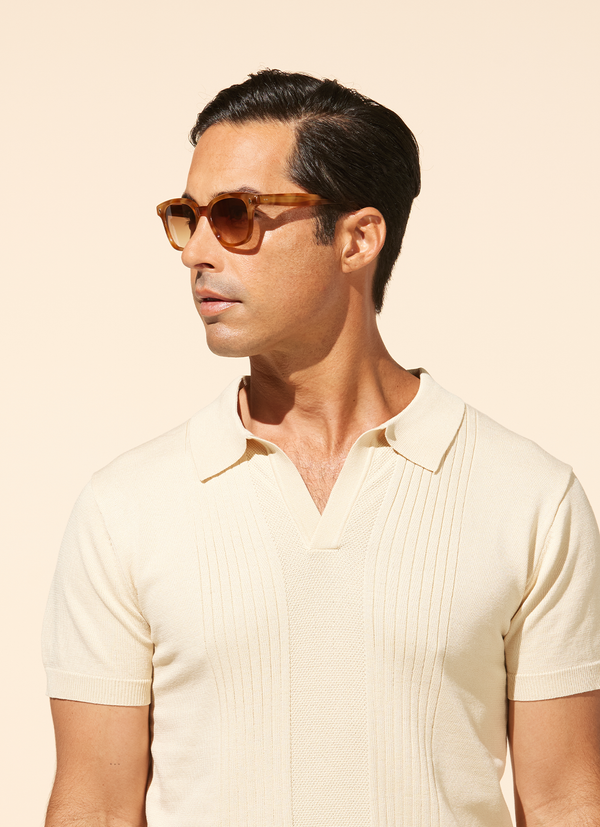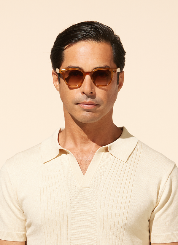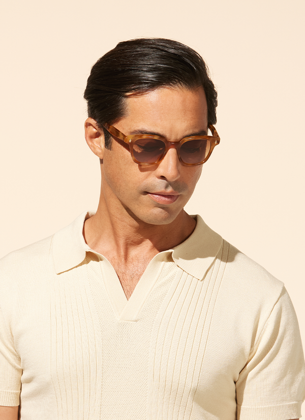 Broadway Sun offers an updated wayfarer style with some throwback putting-green inspiration. Designed with contoured temples to mimic 50s car fins, its dimensions are slightly larger than its predecessors. Finished with water-drop plaques along the endpieces and semi-flat lenses with 100% UV protection.