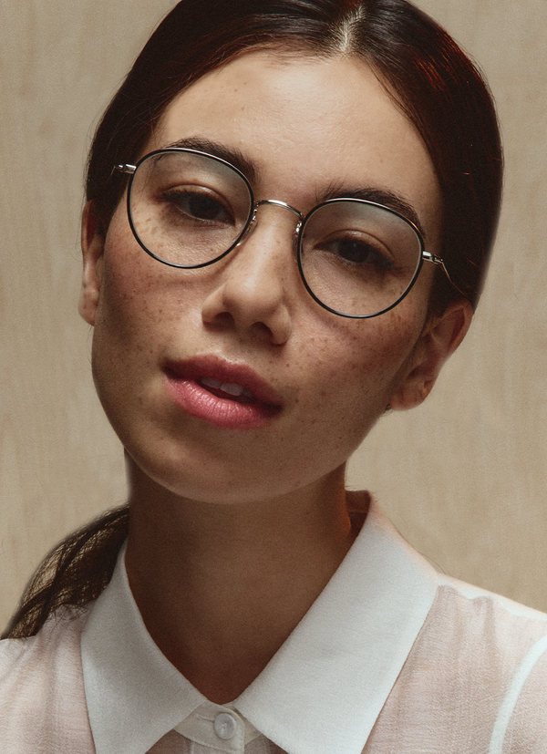 A round, lightweight, classic P3 metal frame with interior Windsor rims and a curved, polished bridge.